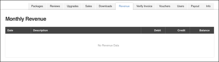 Sales 选项卡显示每个付费资源包的销售数据(一行表示一个资源包)。此处还会显示所选月份的总额 (Gross) 和净额 (Net)。可以通过更改下拉框中的月份来查看不同月份的销售数据。