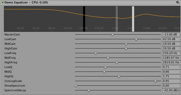 After Unity loads the native plug-in dlls and registers the contained audio plug-ins, it starts looking for corresponding GUIs that match the names of the registered plug-ins. This happens through the Name property of the EqualizerCustomGUI class which, like all custom plugin GUIs, must inherit from IAudioEffectPluginGUI. The only important function inside this class is the bool OnGUI(IAudioEffectPlugin plugin) function. Through the IAudioEffectPlugin plugin argument this function gets a handle to the native plugin that it can use to read and write the parameters that the native plugin has defined.