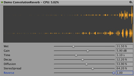 The example plug-ins that Unity provides come package with utility functions that’s easy to start with. As an example, use the Ring Modulator example plug-in, which is a simple plug-in. It multiplies the incoming signal by a sine wave, which gives a nice radio-noise and broken reception like effect, especially if you chain together multiple ring modulation effects with different frequencies.