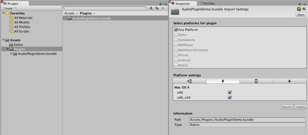 Native audio plug-ins use the same scheme as other native or managed plug-ins, in that, they must be associated with their respective platforms via the plug-in importer inspector. For information about the subfolders and where to place plug-ins, see Building plug-ins for desktop platforms. The platform association is necessary so that the system knows which plug-ins to include on a each build target in the standalone builds, and with the introduction of 64-bit support this even has to be specified within a platform. macOS plug-ins are useful because it supports universal binary format, which allows them to contain both 32 and 64 bit variants in the same bundle.