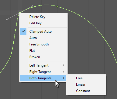 一个关键点有两条__切线__:一条在左侧用于向内的斜坡,另一条在右侧用于向外的斜坡。切线可控制关键点之间的曲线形状。可从许多不同的切线类型中进行选择一种类型,用于控制曲线离开一个关键点并到达下一个关键点的方式。右键单击一个关键点可以选择该关键点的切线类型。