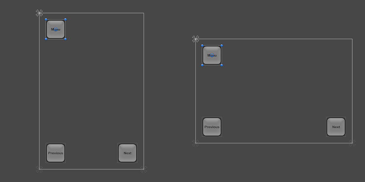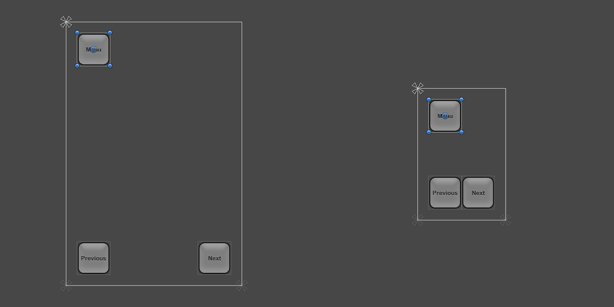 当屏幕大小更改为更大或更小的分辨率时,按钮也仍然锚定到各自的角点。但是,由于按钮保持原始大小(以像素为单位),因此按钮占据屏幕的比例可能会变大或变小。这种状态可能符合需求,也可能不符合需求,具体情况取决于您希望布局在不同分辨率的屏幕上的表现方式。