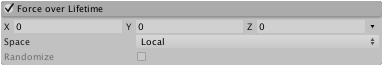 This module is part of the Particle System component. When you create a new Particle System GameObject, or add a Particle System component to an existing GameObject, Unity adds the Force over Lifetime module to the Particle System. By default, Unity disables this module. To create a new Particle System and enable this module: