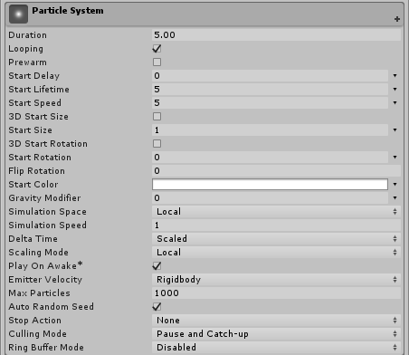 | Emitter Velocity | Choose how the Particle System calculates the velocity used by the Inherit Velocity and Emission modules. The system can calculate the velocity using a Rigidbody component, if one exists, or by tracking the movement of the Transform component. If no Rigidbody component exists, the system uses its Transform component by default. | |