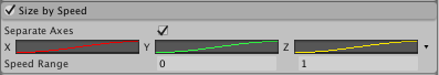 您可以指定粒子的宽度、高度和深度大小如何分别随速度变化。在 Size by Speed 模块中,选中 Separate Axes 复选框,然后选择粒子的 X(宽度)、Y(高度)和 Z(深度)如何受粒子速度的影响。请注意,Z 仅用于网格粒子。