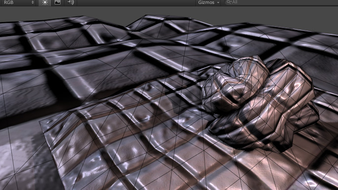 disp 对位移贴图进行采样并沿法线移动顶点。appdata),而不是默认的 appdata_full。目前这还不是必需的,但是使用尽可能小的结构进行曲面细分会更高效。nolightmap 指令来排除光照贴图。下图显示了应用此着色器的一些简单游戏对象。