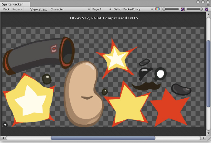 When designing Sprite graphics, it is convenient to work with a separate Texture file for each character. However, a significant portion of a Sprite Texture will often be taken up by the empty space between the graphic elements and this space will result in wasted video memory at runtime. For optimal performance, it is best to pack graphics from several Sprite textures tightly together within a single Texture known as an atlas. Unity provides a Sprite Packer utility to automate the process of generating atlases from the individual Sprite textures.