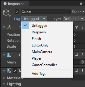 A tag is a reference word which you can assign to one or more GameObjects. For example, you might define “Player” tags for player-controlled characters and an “Enemy” tag for non-player-controlled characters. You might define items the player can collect in a Scene with a “Collectable” tag.