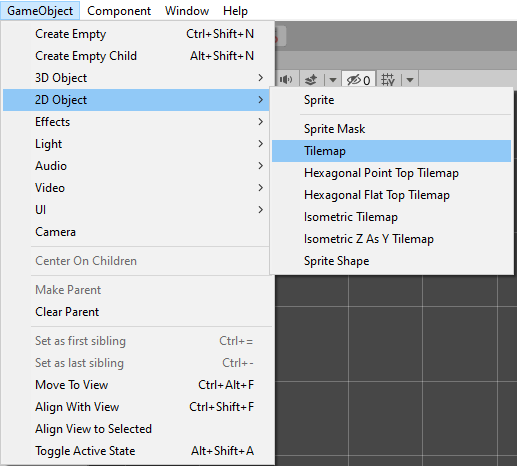 瓦片地图是用于放置所选瓦片的游戏对象。通过转到 GameObject > 2D Object > Tilemap 可以创建默认(矩形)__瓦片地图。如果看不到这些选项,则表示可能未安装 2D Tilemap Editor__ 包。如果确实如此,请通过 Package Manager 下载 2D Tilemap Editor 包。