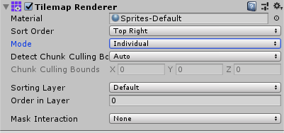 When set to Chunk Mode, the Tilemap Renderer handles Sprites on a Tilemap in batches and renders them together. They’re treated as a single sort item when sorted in the 2D Transparent Queue. While this reduces draw calls, other renderers can’t render between any part of the Tilemap, preventing other rendered Sprites from interweaving with Tilemap Sprites.