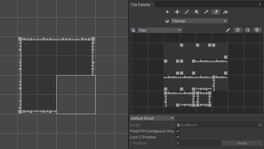 Select the Tile from the Tile Palette (left) to automatically Flood Fill the four identical Tiles in the middle of the Tilemap (right).