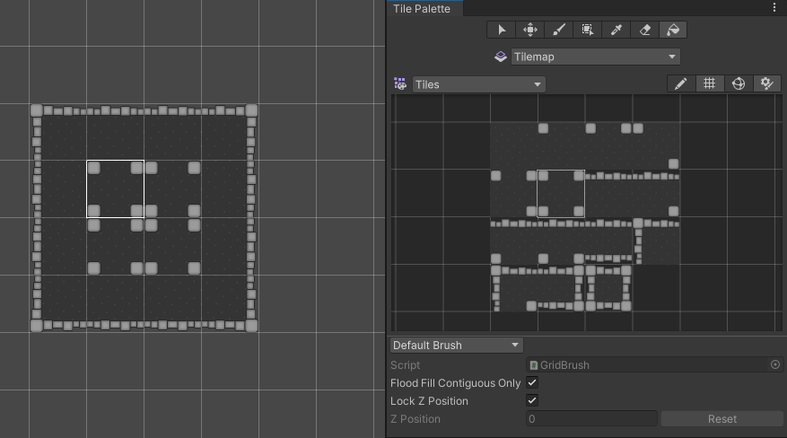 Selecting a Tile from the Tilemap Palette (right) and painting it onto the Tilemap (left) with the Paintbrush Tool.