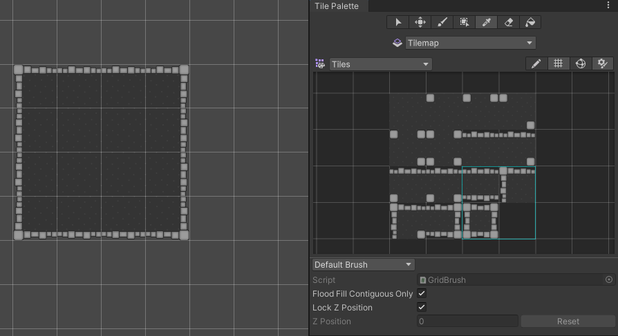 Selecting Tiles from the Tilemap Palette (right), then painting with the Box Fill Tool (left) on the Tilemap.