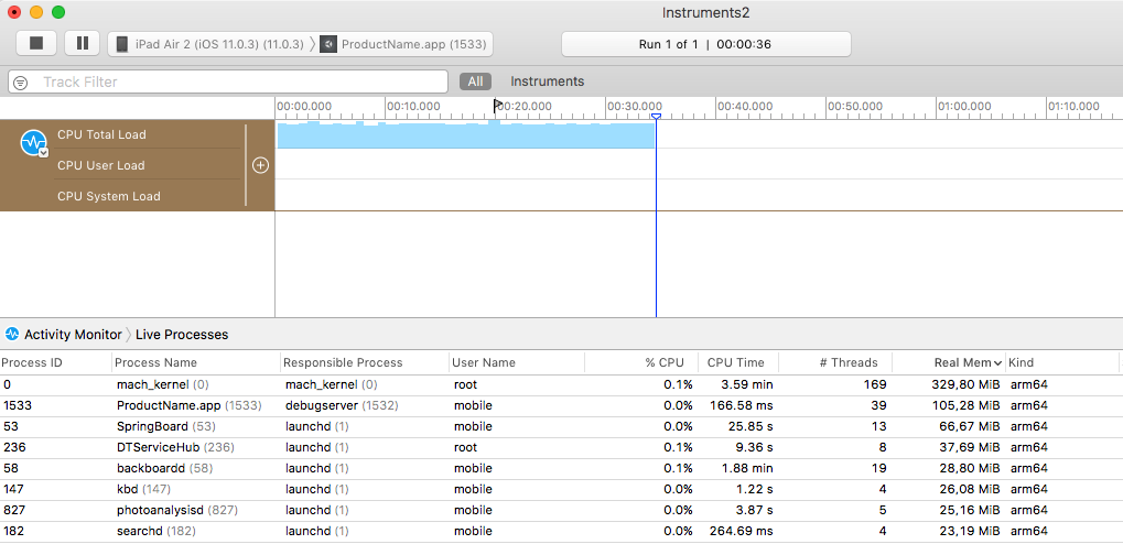有时,可能会看到如下所示的消息:_Program received signal: “0”_。 这条警告消息通常不是致命的,只是表明 iOS 内存不足,并要求应用程序释放一些内存。通常,后台进程(如邮件)会释放一些内存,同时您的应用程序可以继续运行。但是,如果您的应用程序继续使用内存或要求更多的内存,操作系统最终会开始终止一些应用程序,而您的应用程序可能就是其中之一。Apple 在文献中说明多大的内存使用量是安全的,但经验观察表明,使用不到 50% 的整体设备 RAM 的应用程序不会遇到严重的内存使用量问题。 您应该依赖的主要指标是应用程序使用的 RAM 大小。应用程序内存使用量由三个主要部分构成: