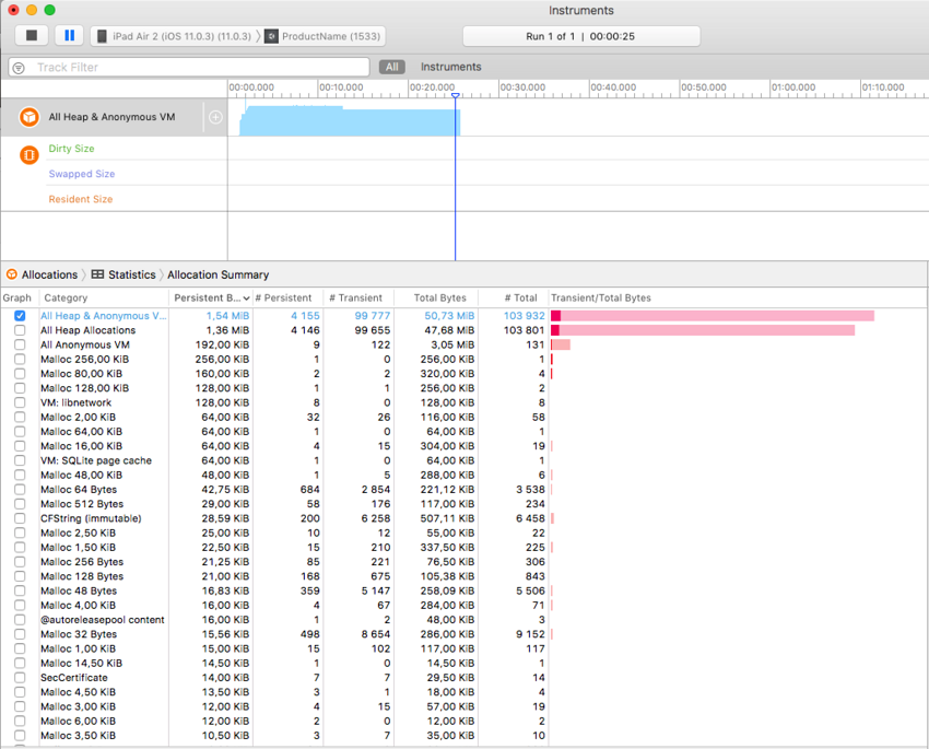 注意:内部性能分析器仅显示 .NET 脚本分配的堆。总内存使用量可以通过 Xcode Instruments 来确定,如上所示。此图包括应用程序二进制文件、一些标准框架缓冲区、Unity 引擎内部状态缓冲区、.NET 运行时堆(由内部性能分析器输出的数字)、GLES 驱动程序堆和其他一些杂项内容等多个部分。