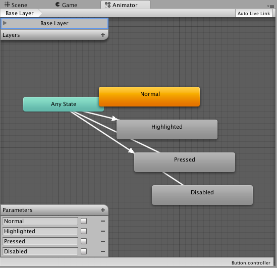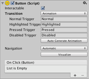 要使用动画过渡模式,必须将动画器组件附加到控制器元素。通过单击“Auto Generate Animation”即可自动完成此操作。此过程也会生成一个已经设置状态的动画控制器,并需要对此进行保存。