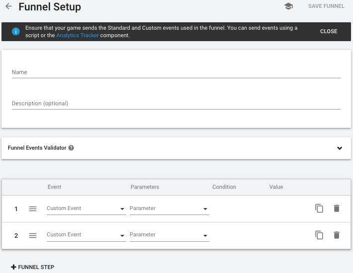 Funnels are based on Standard and Custom events. Unity Analytics evaluates each step in a funnel according to whether the defined standard or custom event has been dispatched with the correct parameter values. In order for users to enter and progress through a funnel, they must complete the funnel steps in the precise order those steps appear in the funnel.