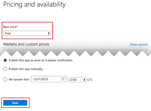 选择 Pricing and availability 以设置价格,并选择 Free(原因如上文所述)。