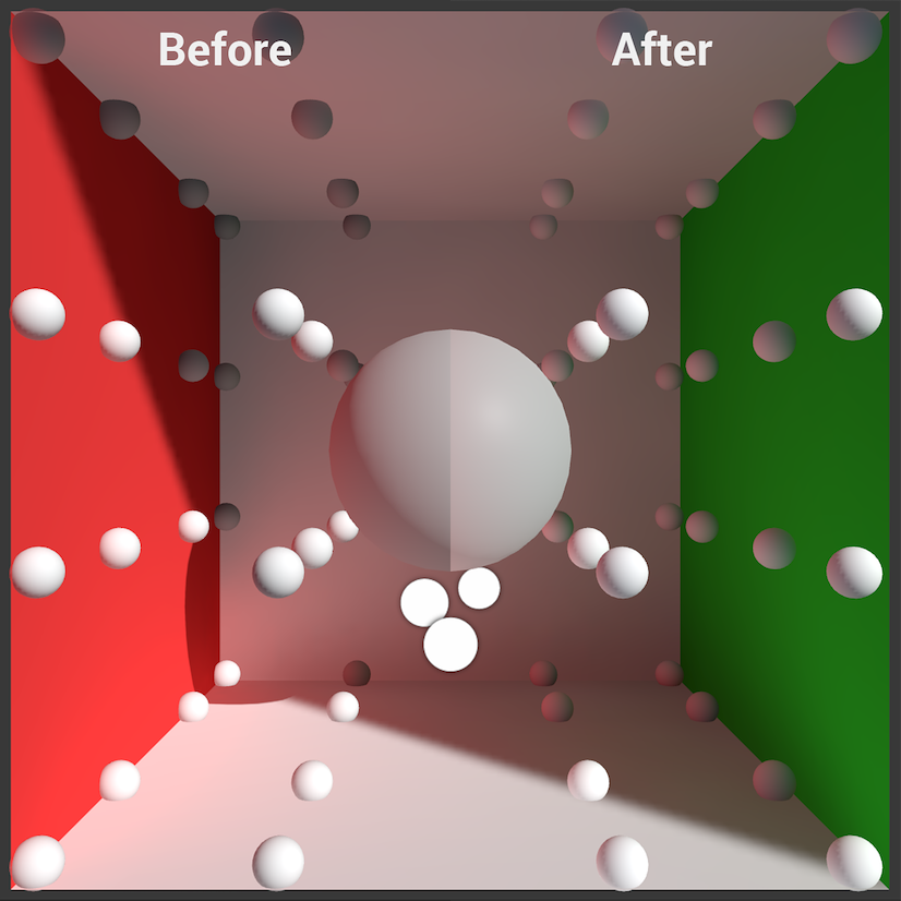 在 2019.1 之前,Indirect Intensity 滑动条仅在使用渐进光照贴图 (Progressive Lightmapper) 时影响光照贴图。对于 Enlighten,该滑动条适用于光照探针和光照贴图。现在所有后端都会将 Indirect Intensity 值应用于光照贴图和光照探针。 再次对光照进行烘焙时,您可能会注意到,如果修改了 Indirect Intensity 值,探针会显得更亮。 在升级后,最好在重新烘焙光照贴图之前清除烘焙数据 (Clear Baked Data)。