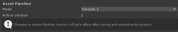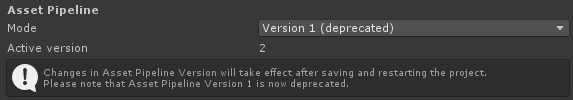选择 Version 2 将告诉编辑器您现在要对该项目使用新的资源导入管线,然后重新启动您的项目就会使用新的资源导入管线代码将项目重新导入。从本质上讲,这一过程与删除 Library 文件夹具有相同的效果,但不会删除这个文件夹。切换为使用资源导入管线 V2 时,原始资源导入管线的导入结果不会被删除,因为 V2 会创建自己的文件夹结构来存储导入结果。 在 Unity 2019.2 或更早版本中创建的项目在默认情况下仍将使用原始资源导入管线。首次在 Unity 2019.3 中打开此类项目时,可以选择升级到新的资源导入管线。如果您拒绝这样做,则项目将继续使用原始的资源导入管线。此外,所选版本会存储在项目的 EditorSettings.asset 文件中,因此可以进行版本控制。