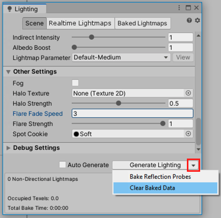 若要在场景中升级 LOD,请清除烘焙光照贴图,然后重新生成它。为此需要执行以下操作: