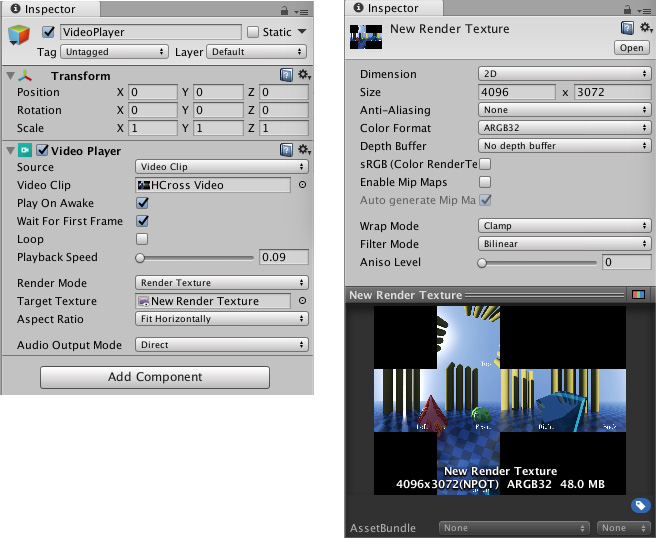 现在,打开视频播放器的 Inspector 窗口,并将 Render Mode 切换到 Render Texture。将新的渲染纹理从 Asset 视图拖到 Target Texture 字段。