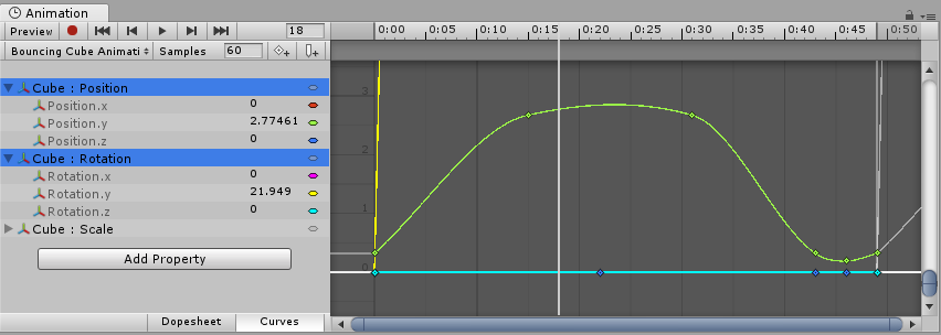 Click on individual properties in the list and press F on the keyboard to automatically re-scale the view to fit the range for that value. You can also manually adjust the zoom of the Curves window by using the drag handles at each end of the view’s scrollbar sliders. In the image below, the Animation Window is zoomed in to view the bouncing Y position Animation. The start of the yellow rotation curve is still visible, but now extends way off the top of the view: