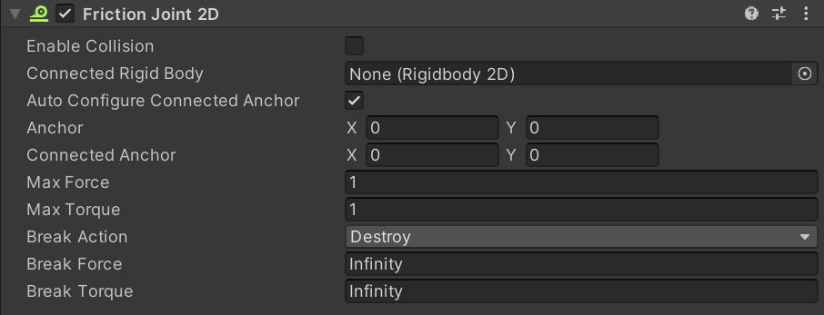 The Friction Joint 2D connects GameObjects controlled by Rigidbody 2D physics. The Friction Joint 2D reduces both the linear and angular velocities between the objects to zero (ie, it slows them down).