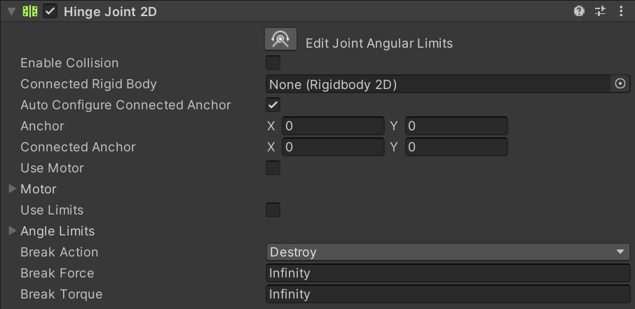 | Auto Configure Connected Anchor | Enable this property to automatically set the anchor location for the other GameObject this Hinge Joint 2D connects to. You do not need to enter coordinates for the Connected Anchor property if you enable this property. | |