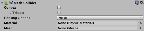 注意:将 Cooking Options 设置为除默认设置之外的任何其他值时,意味着 Mesh Collider 必须使用一个 isReadable 值为 true 的网格。