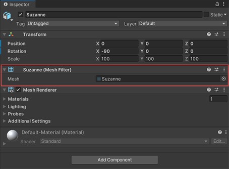 Mesh Filter 组件包含对网格的引用。该组件与同一个游戏对象上的 Mesh Renderer 组件配合使用;Mesh Renderer 组件渲染 Mesh Filter 组件引用的网格。