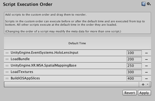 序号是任意数,不代表任何物理数量。Editor 将这些值存储在脚本元数据文件中。您可以在序号之间留一些间隔,这有助于在列表中添加或移动其他脚本时避免进行无关的文件更改。