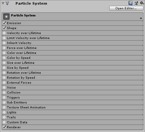粒子系统组件具有许多属性,为方便起见,Inspector 将它们组织成多个称为“模块”的可折叠部分。这些模块在单独的页面中进行介绍。请参阅有关粒子系统模块的文档以了解每个模块。