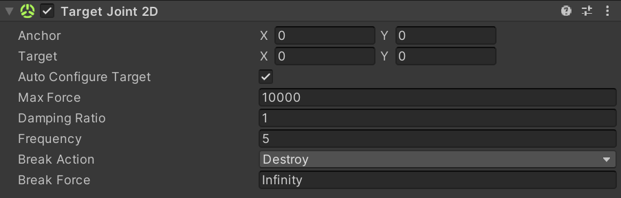 When the spring applies its force between the Rigidbody object and target, it tends to overshoot the distance you have set between them, and then rebound repeatedly, giving in a continuous oscillation. The Damping Ratio sets how quickly the Rigidbody object stops moving. The Frequency sets how quickly the Rigidbody object oscillates either side of the distance you have specified.