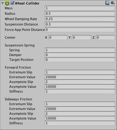 通过从__中心 (Center)__ 向下穿过局部 Y 轴进行射线投射来执行车轮的碰撞检测。车轮具有__半径 (Radius),并且根据__悬架距离 (Suspension Distance) 向下延伸。通过脚本使用不同属性来控制车辆,这些属性包括:__motorTorque、brakeTorque__ 和 steerAngle。有关更多信息,请参阅车轮碰撞体脚本参考。