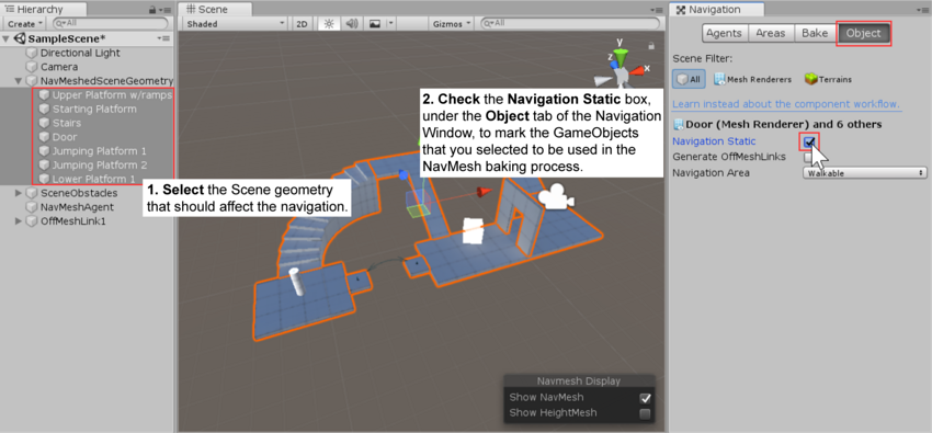 The process of creating a NavMesh from the level geometry is called NavMesh Baking. The process collects the Render Meshes and Terrains of all Game Objects which are marked as Navigation Static, and then processes them to create a navigation mesh that approximates the walkable surfaces of the level.