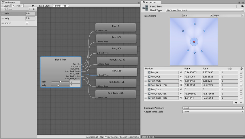 我们继续将扫射集组织在 2D 混合树中;选择混合类型:2D Simple Directional,并使用 Compute Positions > Velocity XZ 放置动画