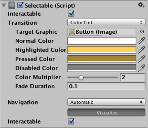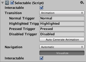 | 动画 (Animation) | 允许根据按钮的状态产生动画,必须存在动画器组件才能使用动画过渡。确保禁用根运动非常重要。要创建动画控制器,请单击 Generate Animation(或自行创建),并确保已将动画控制器添加到按钮的动画器组件。 |