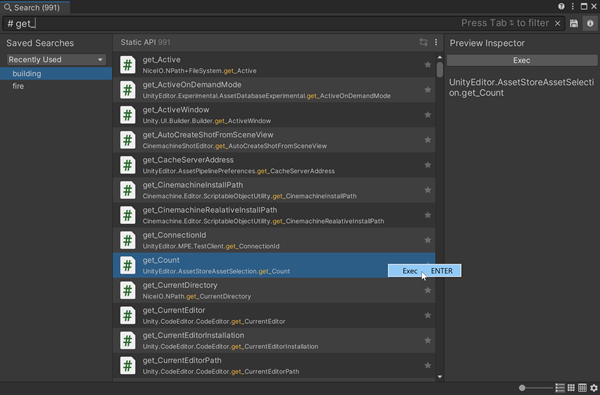 The Static API Search Provider indexes all of Unity’s parameterless public static API methods and properties, and makes them available to execute.