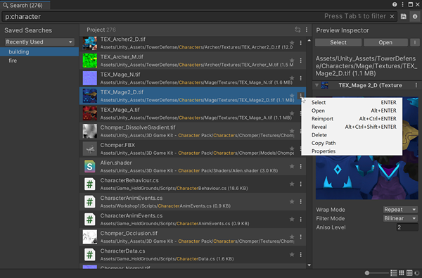 You can also search the Asset Database or the file system from the Search window.