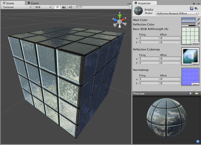 此着色器将模拟反射表面,如汽车、金属物体等。它需要一个环境立方体贴图来定义具体的反射。主纹理的 Alpha 通道定义了对象表面上的反射强度。任何场景光源都会在反射对象上增加亮度。