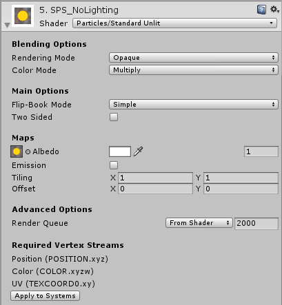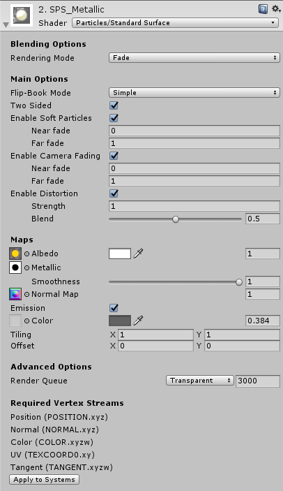 此着色器具有与标准着色器类似的功能,但特别适合粒子。与标准着色器一样,此着色器支持基于物理着色。不包括那些不适合动态粒子的功能,例如光照贴图。