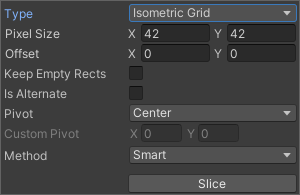 The Isometric Grid option attempts to slice the sprite sheet which has its sprites laid out in alternating rows of half-height diamonds. When sliced, the resulting SpriteRects will have custom outlines and physics shapes corresponding to the half-height diamonds.