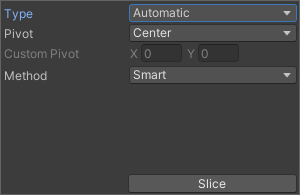 In this panel, you can set the default pivot for each sliced sprite with the Pivot and Custom Pivot options. If there are existing selections in the editor window before applying the Automatic slicing, select from the following options in the Method menu to choose how Unity handles the existing selections:
