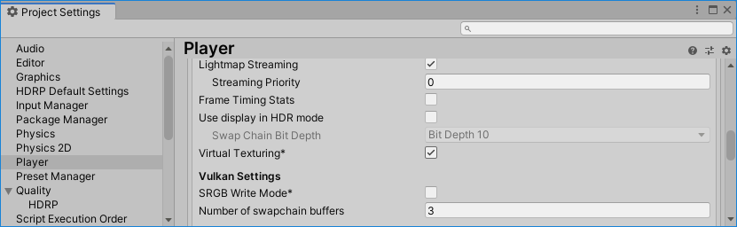 要启用 Streaming Virtual Texturing,需要在项目中启用 Virtual Texturing。为此,请转到 Edit > Project Settings > Player 并启用 Virtual Texturing 设置。