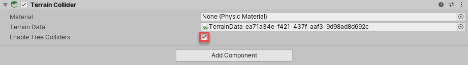 还必须在 Terrain Collider 组件中启用 Enable Tree Colliders。