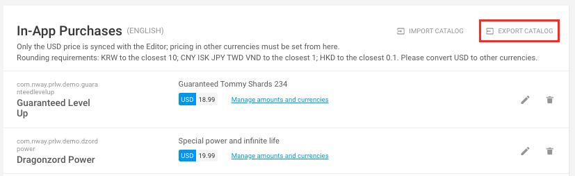 对于所有实现,你都可以使用批量 IAP 导入功能为现有 IAP 商品分配更多语言的描述和更多货币的价格。
