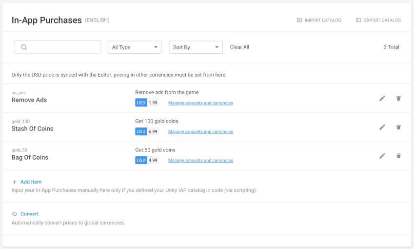 注意:如果要支持大量 IAP 商品和货币,可使用转换功能根据为每个 IAP 商品设置的美元金额将所有 IAP 价格自动转换为全球货币。此操作将覆盖先前设置的任何本地价格。