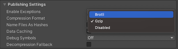 如果要构建发布版本,Unity 将根据在 WebGL Player 设置的 Publishing Settings 面板中选择的 Compression Format 来压缩构建输出文件。
