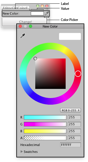 void OnGUI() { matColor = EditorGUI.ColorField(new Rect(3, 3, position.width - 6, 15), "New Color:", matColor); if (GUI.Button(new Rect(3, 25, position.width - 6, 30), "Change!")) { ChangeColors(); } }